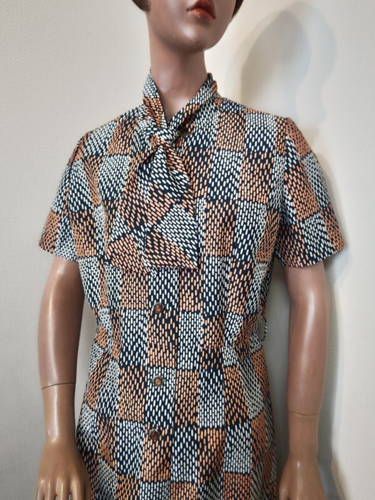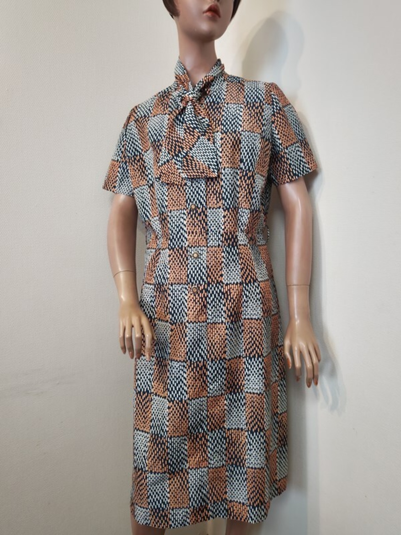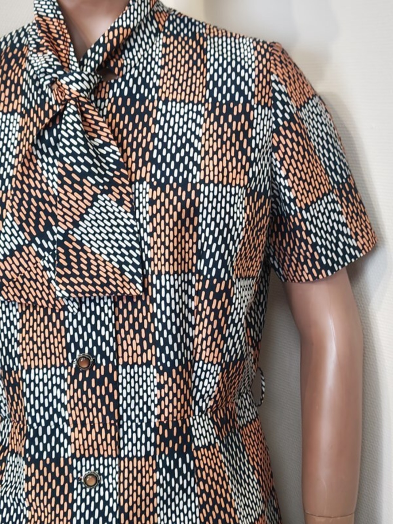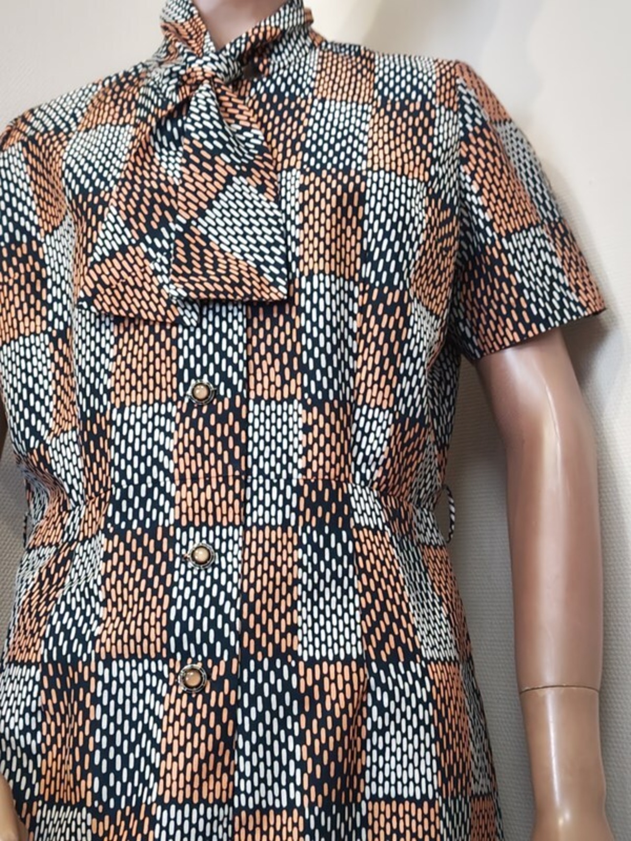 お仕立て品*黒白オレンジ幾何学柄・帽タイレトロワンピ