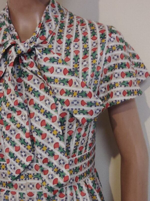 お仕立て品*お花xストライプ柄・レトロリボンタイワンピ